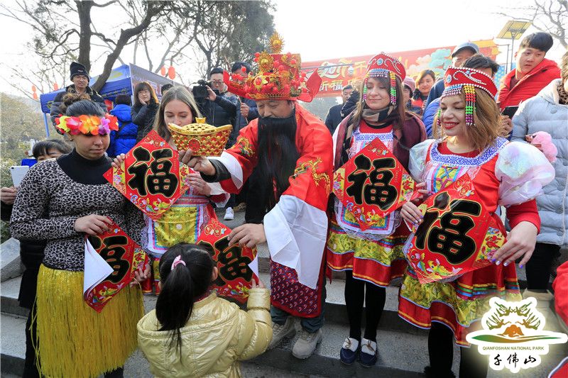 景区内欢乐祥和,节日气氛浓厚。“迎财神”民俗文化活动成为今天吸引游人的一大亮点,演员扮成“财神”和几位洋妞一起在热闹的祈福庙会上巡游送福,派送财神年画,“财神”现场与游客互动,为人们送财气,添福气。