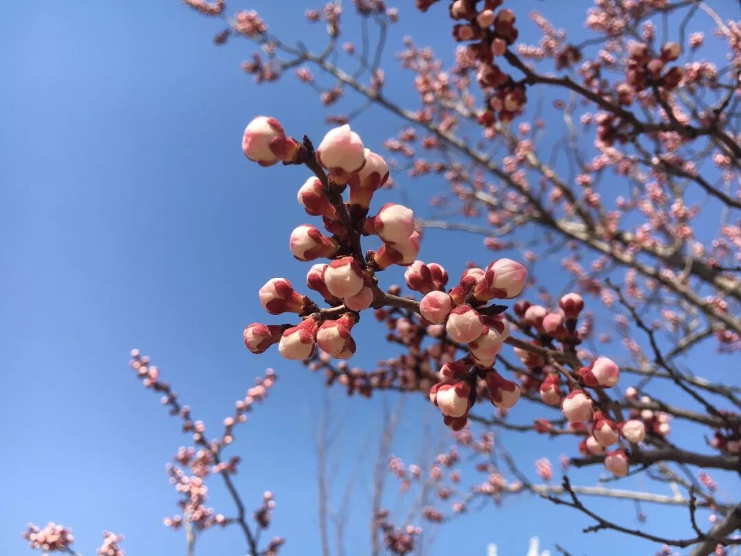桃园内,一串串密密匝匝的花苞挂满了杏树枝头,在一阵暖风吹拂下,仿佛顷刻间便呼之欲出,还有的已经迫不及待一展芳容,与那蜿蜒的林间小径相互映衬,更多添了几分诗情画意。