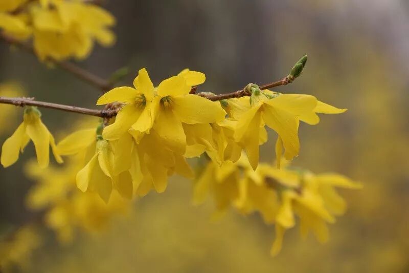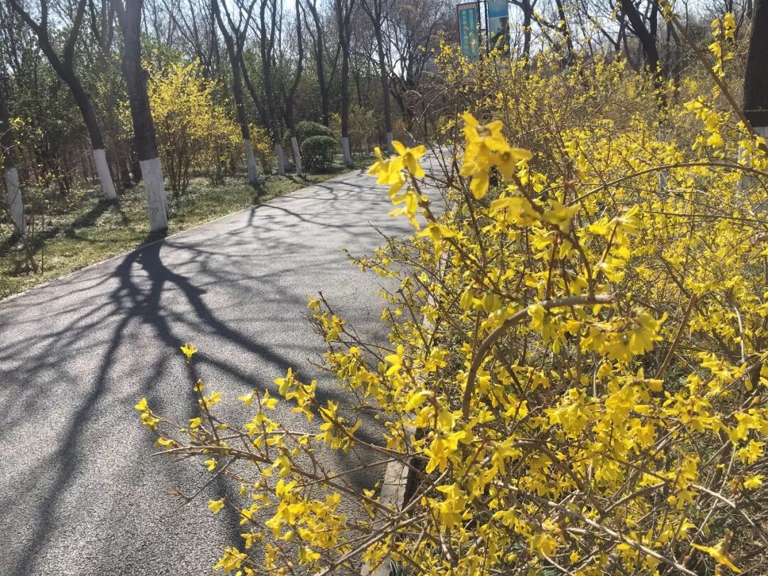 连翘路上,大片大片的连翘次第开放。阳光下,一串串盛开的连翘花犹如金光闪耀的绶带,小孩在丛中追逐,年轻人在其中拍照留念,老年人在花中悠闲散步,尽情感受春的气息。